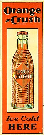 Orange Crush signs proved to be hugely popular with collectors. An exceedingly rare 1930s Canadian Orange Crush single-sided tin sign, 54 inches tall by 18 inches wide, graded 8.75, marked “St. Thomas Metal Signs, Ltd., Ontario,” sold for $6,490.